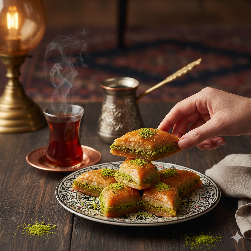 Baklava in Turkey is not just a dessert; it’s part of the culture of hospitality. It is often served during weddings, festivals like Eid (Bayram), or when welcoming guests. In fact, offering baklava is seen as a gesture of respect and kindness. It is usually enjoyed with a cup of strong Turkish tea or coffee, which balances the sweetness perfectly.