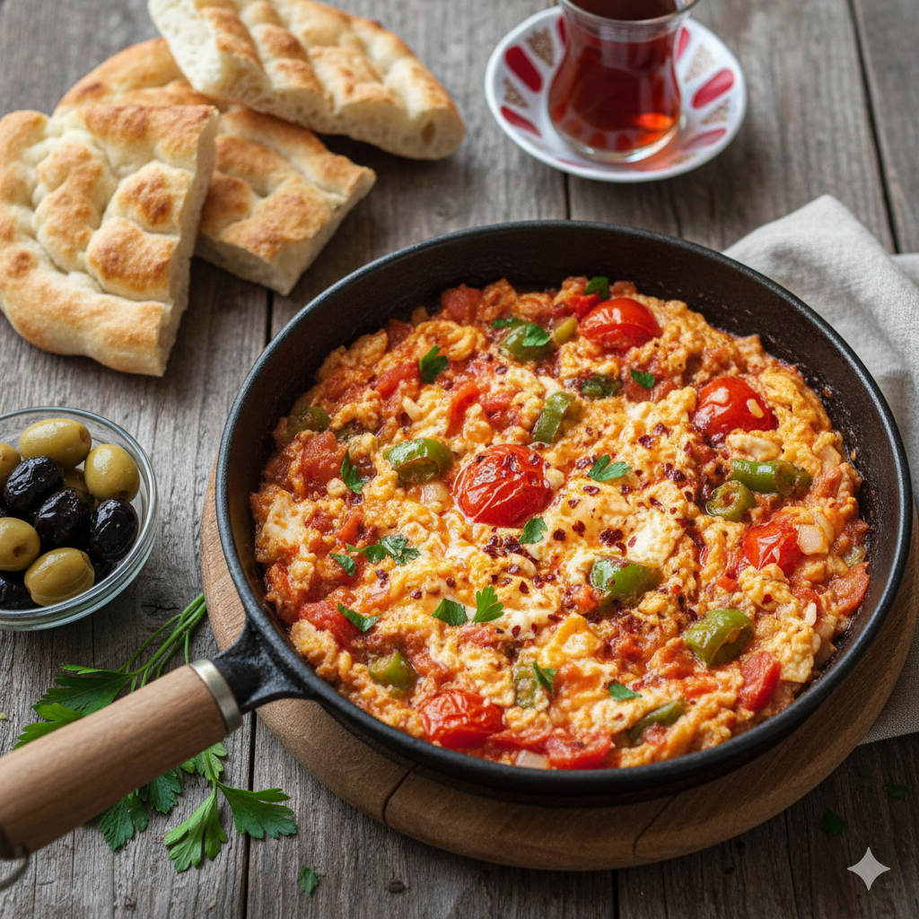 A classic Turkish breakfast dish made with eggs, tomatoes, green peppers, and spices, sometimes cooked with cheese or sucuk (Turkish sausage).