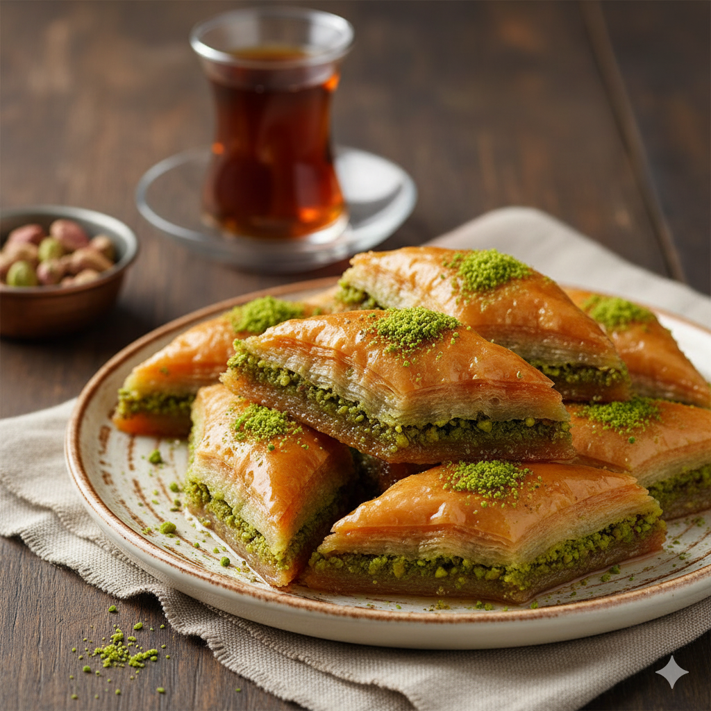 Baklava is a layered pastry made with phyllo dough, chopped nuts (usually pistachios or walnuts), and sweetened with honey or syrup.
